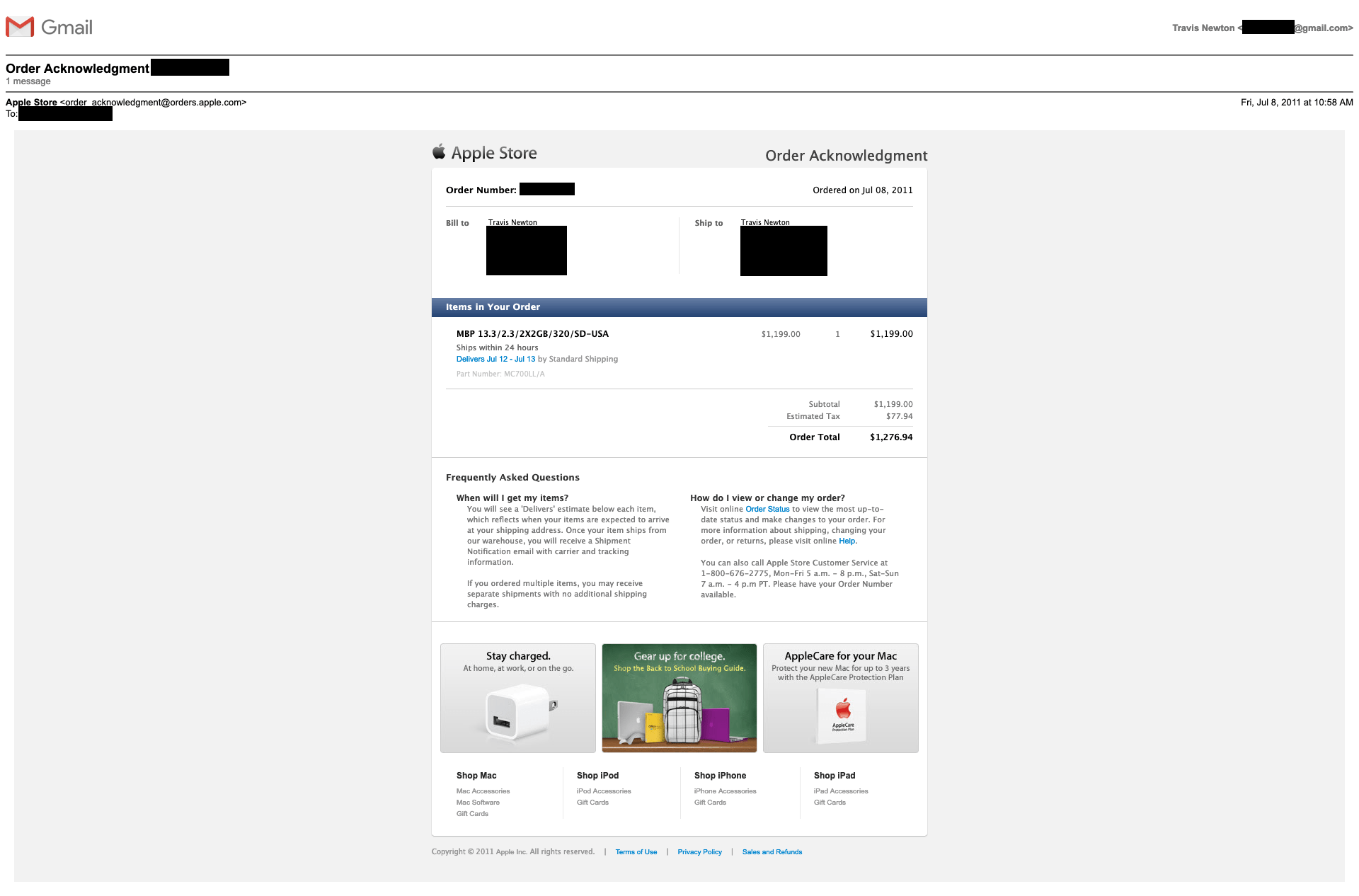 I ordered my first MacBook Pro in July of 2011. I still have the original order email: