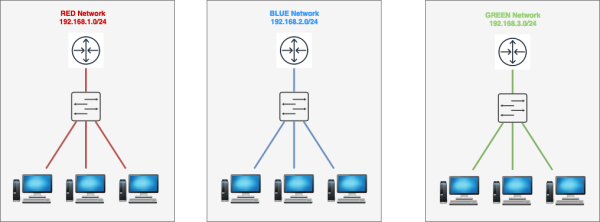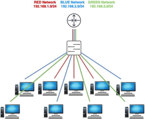 You can see we have 3 networks - RED, BLUE, and GREEN. Each has its own subnet, router, and switch. There are 3 computers attached to each of these networks. Now imagine we combine these three separate networks into one physical network, but we still keep the RED, BLUE, and GREEN networks separate.